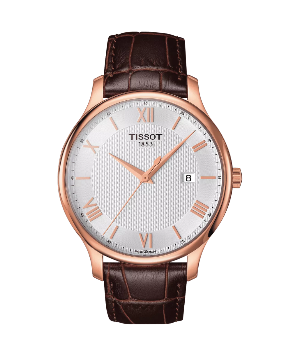 Elevate your wardrobe with a watch that reflects classic Swiss watchmaking and refined aesthetics. The elegant silver dial, enhanced by Roman numeral hour markers and polished hands, delivers a distinguished and timeless appearance. Encased in a 42 mm rose gold PVD-coated stainless steel case and protected by a scratch-resistant sapphire crystal, this watch pairs effortlessly with a rich brown leather strap for a look that transitions seamlessly from professional settings to formal occasions. The Tissot Tradition embodies heritage design with contemporary precision.